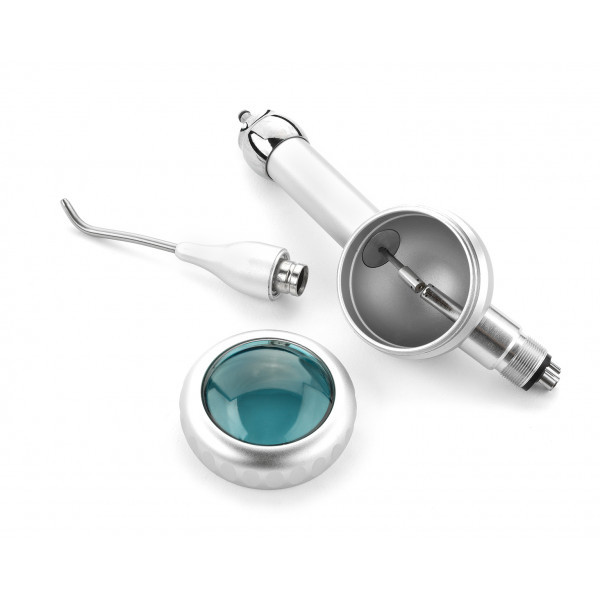 Система для удаления зубного налета и полирования зубов методом содоструйной обработки. Принцип работы основан на создании под давлением воздуха аэроабразивной смеси, состоящей из порошка бикарбоната натрия с определенным размером частиц и воды. Образующийся спрей быстро и безболезненно удаляет бактерии, мягкий налет и межзубные отложения. Сопло съемное, автоклавируемое, вращается на 360 градусов.