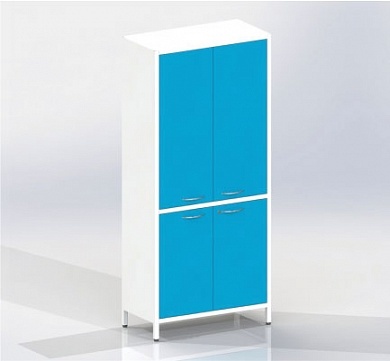 Шкаф двухстворчатый на ножках, верхняя и нижняя секция с металлическими дверцами с замками, верхняя секция с двумя металлическими полками, нижняя секция с одной металлической полкой.