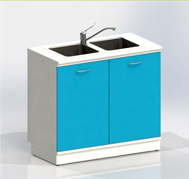 Тумба с двумя дверцами, с вырезом в задней стенке для подвода коммуникаций, оснащена двухчашевой мойкой из нержавеющей стали, локтевым смесителем, сифоном.